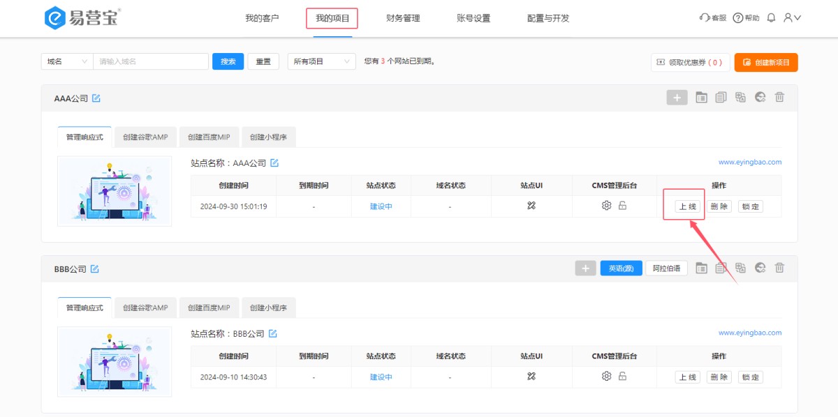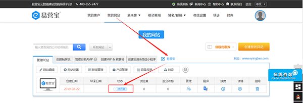1、进入“我的网站”,找到要上线的网站,点击“上线”按钮,会弹出上线窗口。
