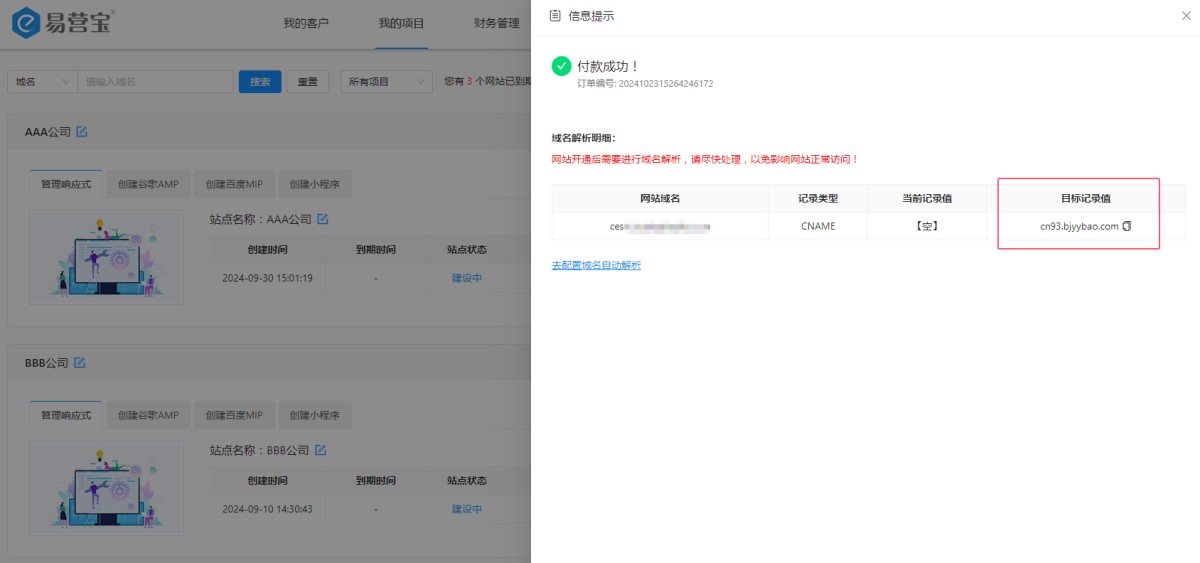 8,最后上线信息确认无误后,点击开通按钮。付款成功后,会显示域名解析地址,如果未配置域名自动解析功能,则需要去域名后台人工添加解析。