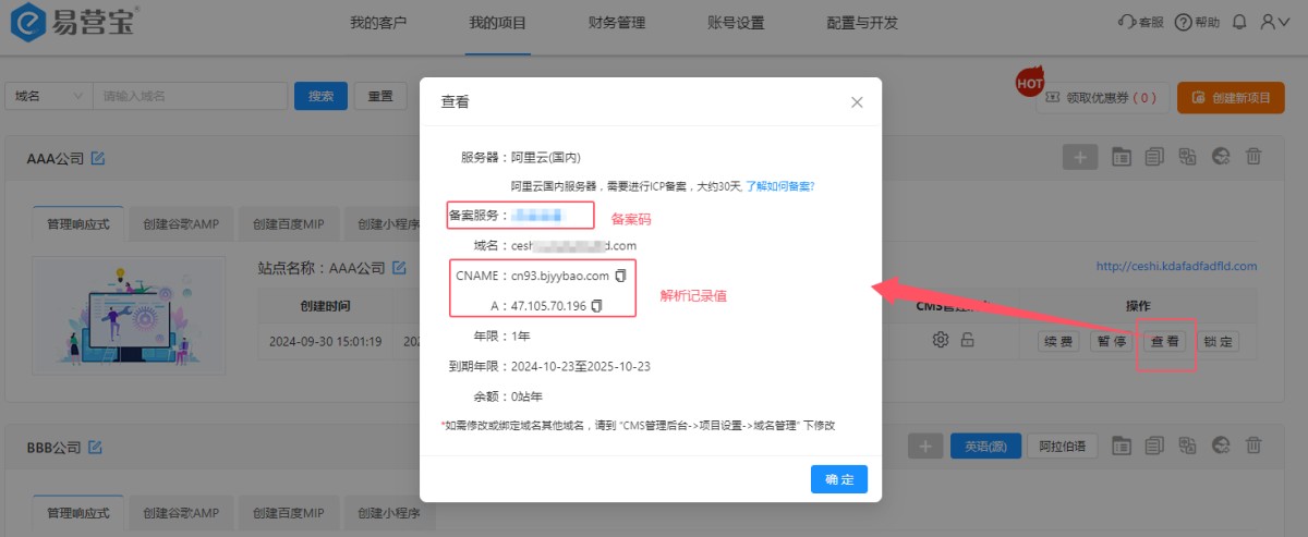 9,网站开启后,系统会检测域名是否解析。点击“查看”按钮,可以查看服务器的解析记录值。如果申请了备案服务号的话,可以在这里查看备案服务号。