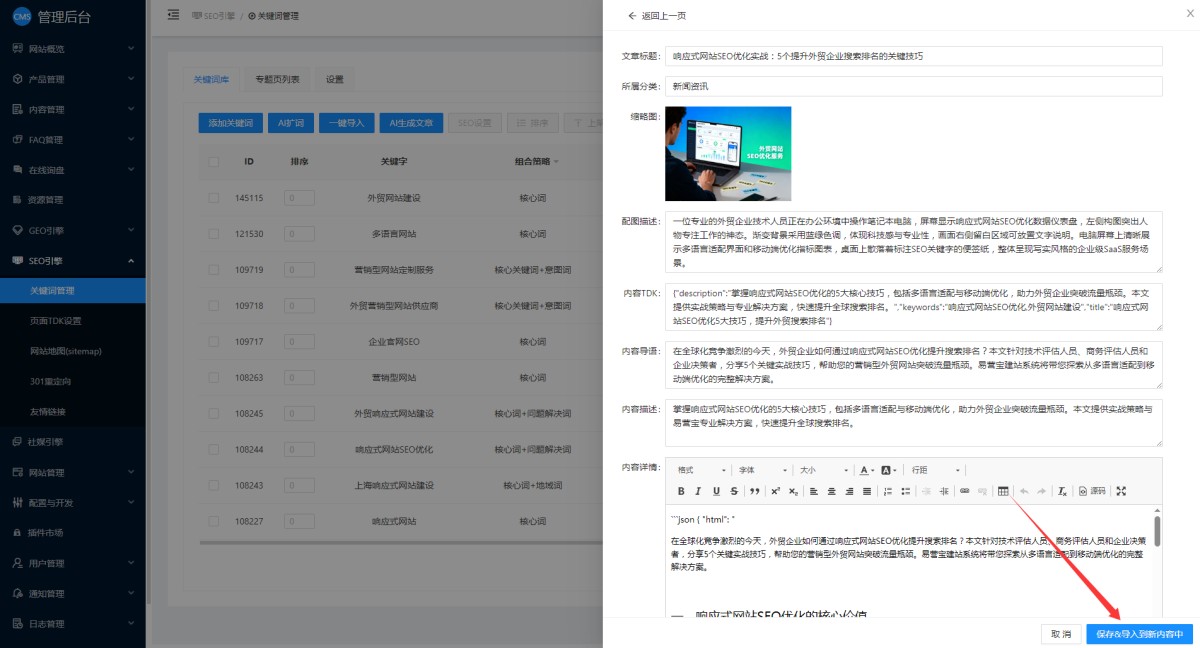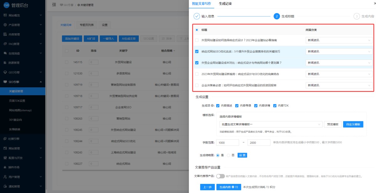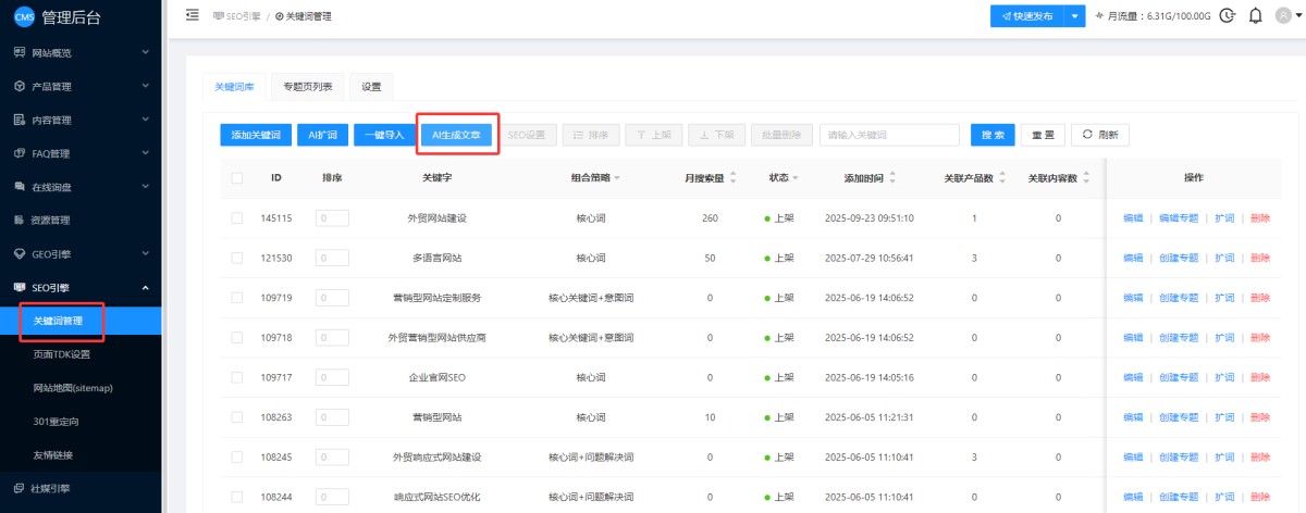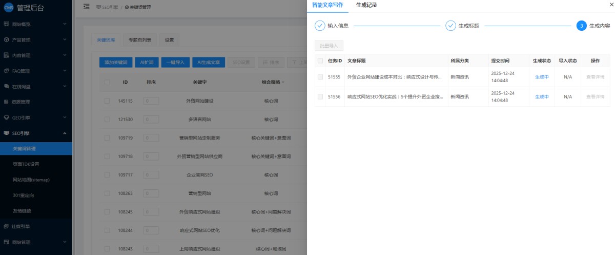 1,AI智能写作在CMS管理后台有两个入口,分别在内容列表里和关键词管理里。