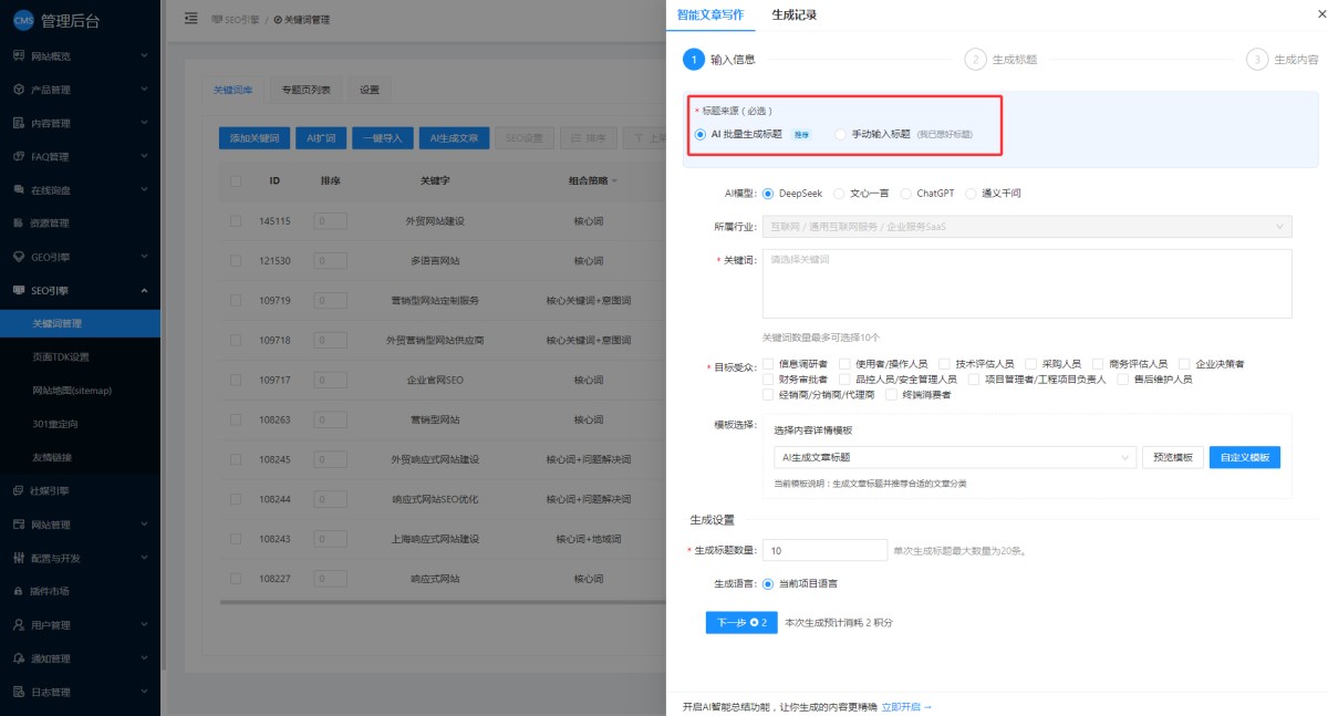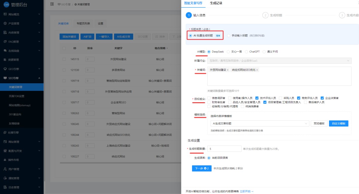 3,选择AI批量生成标题时,要选择AI模型,关键词,目标受众,模板和生成标题的数量。点击下一步,AI就会根据提示信息生成文章标题。