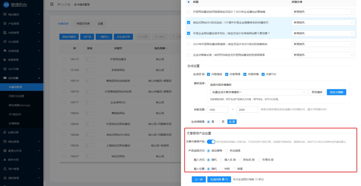 6,可以选择是否在文章推荐产品设,并设置推荐的方式和位置。