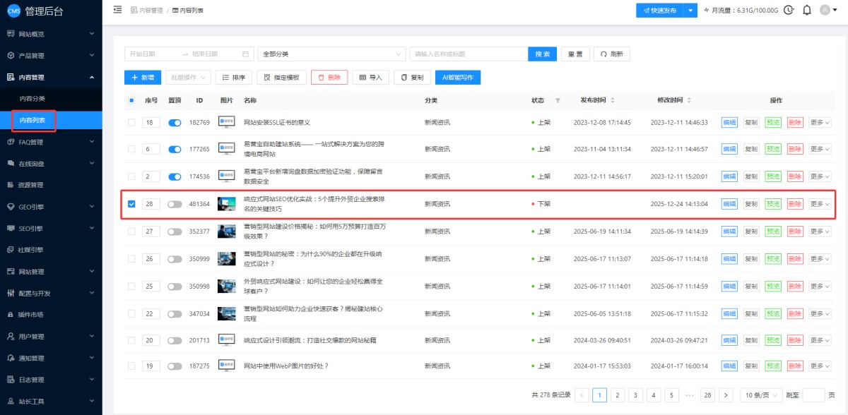 10,导入的文章,会显示在内容列表里,状态为下架。改为上架后,保存发布,就会在网站上显示了。