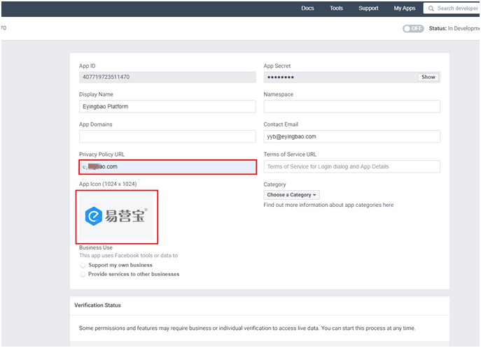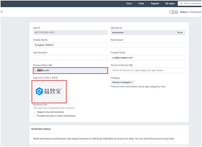 9,填写Privacy Policy URL(网站隐私协议链接,如果没有,填写官网也可以)和上传APP Icon(512*512到1024*1024之间)。注意:此处填写客户的链接和icon图标,不是填写易营宝的。