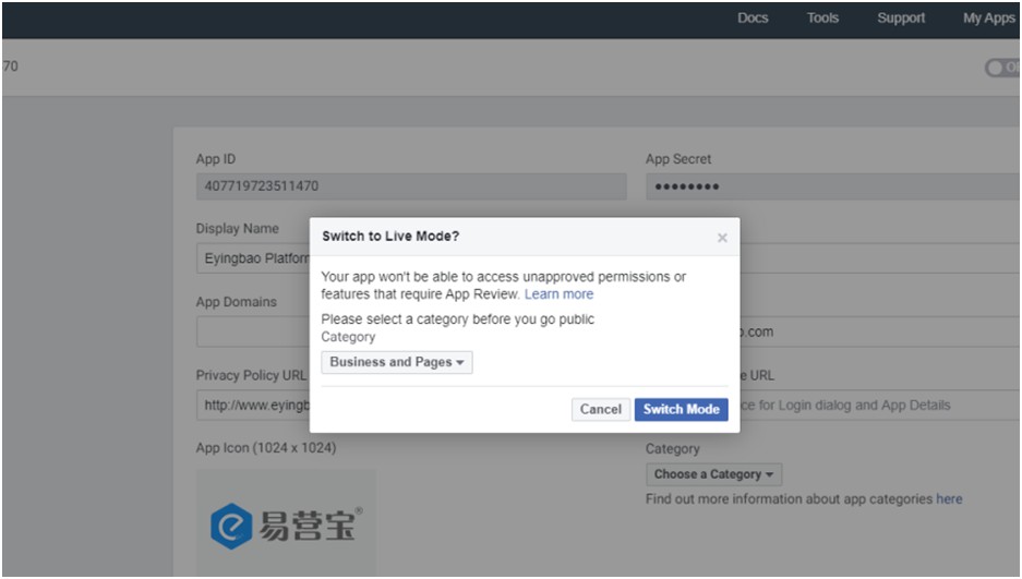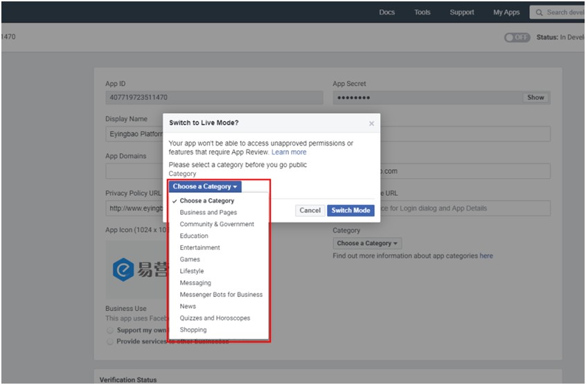 11,点击Choose a Category 选择类别(选择Business and Pages即可),点击Switch Mode(切换模式)按钮。