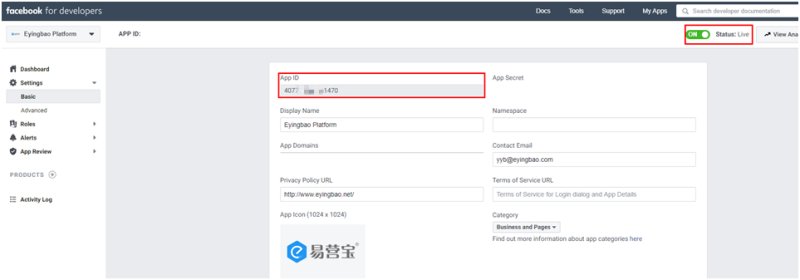 12,切换后,App的状态在右上方显示为绿色的Live,App ID显示在页面第一行