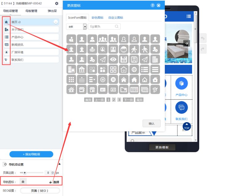 2,侧导航的ICON有两种修改方式,一是在导航管理里直接点击ICON,会弹出更改图标的窗口;二是在右下角导航项设置里,点击选择导航图标,也会弹出更改图标的窗口。图标可以选择系统自带的图标,也可以在自定义图标里本地上传。