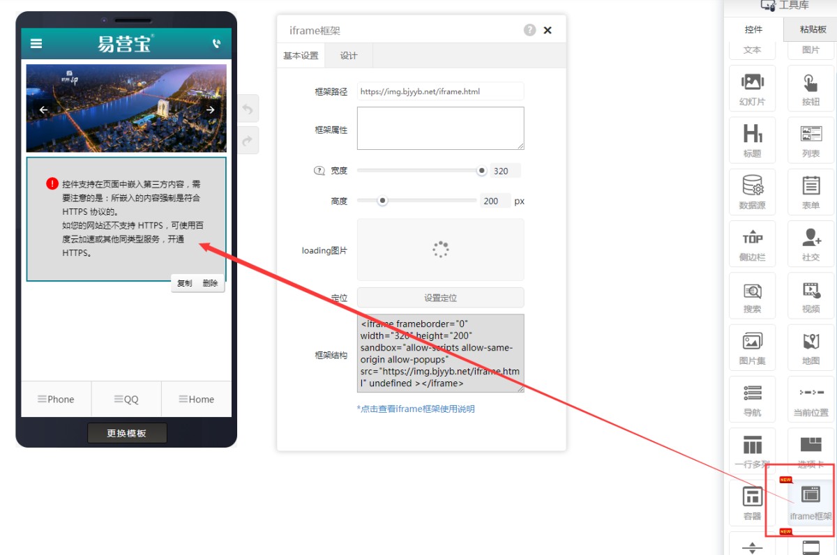 将iframe代码中的链接,添加到框架路径里。注:路径必须是安全网址,即HTTPS开头的。