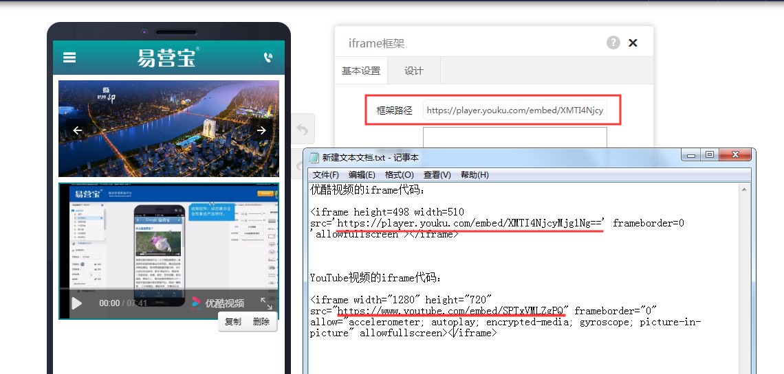 2,将从第三方获取的iframe代码添加到控件属性里,以下用优酷视频和Youtube视屏上获取的iframe代码举例。