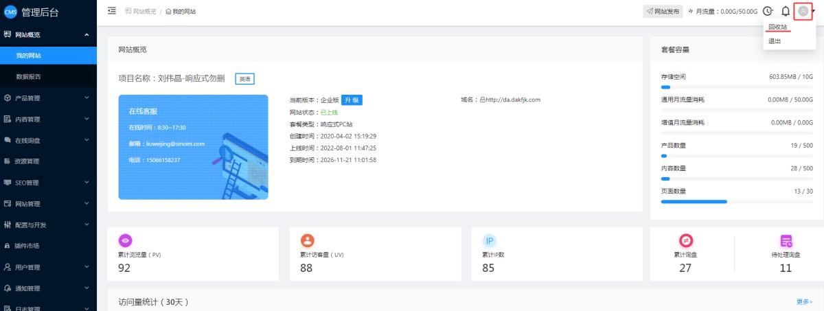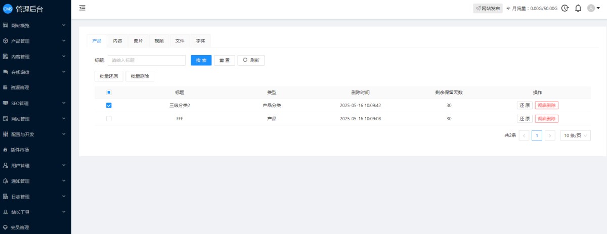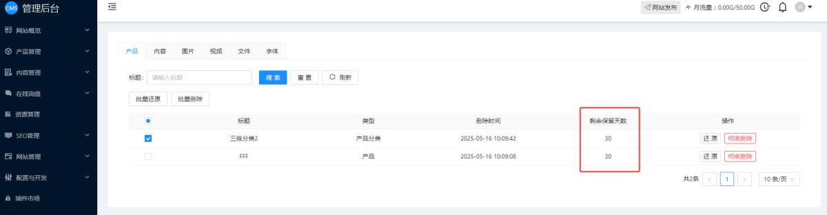 用户在CMS后台删除产品、新闻、或资源库里的图片视频等,为了防止误删,我们增加了回收站功能,删除的产品、新闻和资源都会进入到回收站,保留30天的数据,在此期间,用户可以还原数据。超过30天后,会彻底删除。