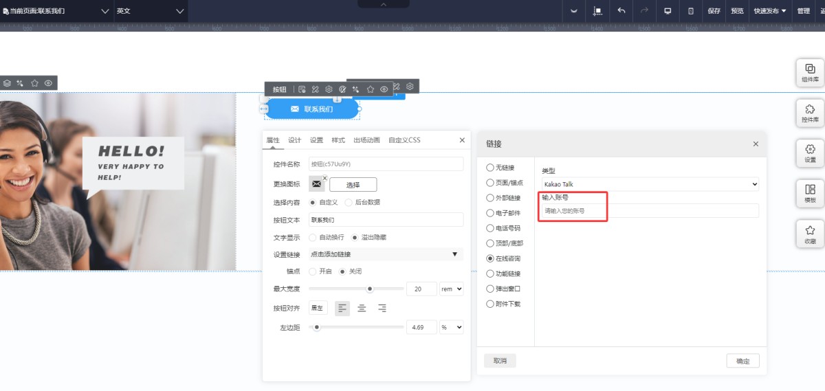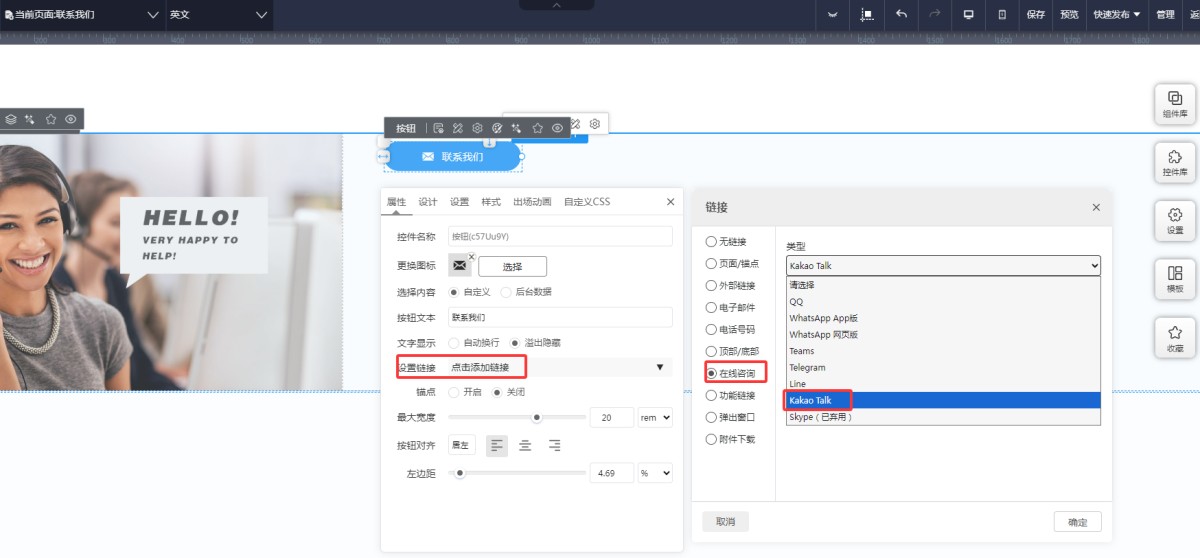 1,在按钮、侧边栏等可以设置联系方式的控件属性里,设置链接里选择在线咨询-KakaoTalk。