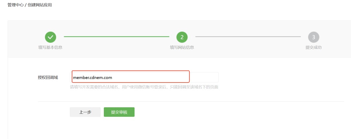 4,在网站信息里,填写授权回调域。此处填写OEM的登录地址链接,如果不确定,可以联系客服查询。填写完成点击提交审核。