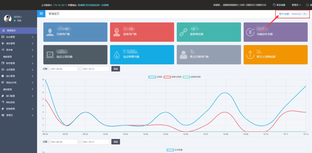 OEM的账户余额也是在OEM超级管理后台查看的。登录超级管理后台,在首页的右上角就会显示账户余额。