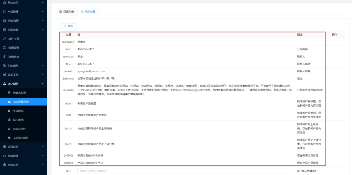 1,我们在设置页面SEO标题、关键和描述时,有时会用到变量,在管理后台-SEO管理-SEO页面列表-规则变量里,有系统默认的变量,也可以自定义变量。
