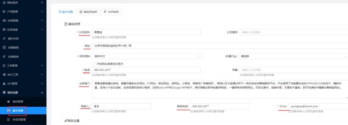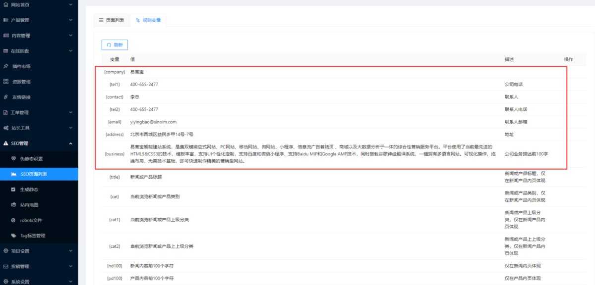 3,在系统的固定变量中,有一些是公司信息,如易营宝SAAS建站系统帮助中心,yiyingbao@sinoim.com,北京市西城区益民巷甲14-7号等(下图框红的变量)。这些变量对应的值,可以在项目设置-基本设置里修改。