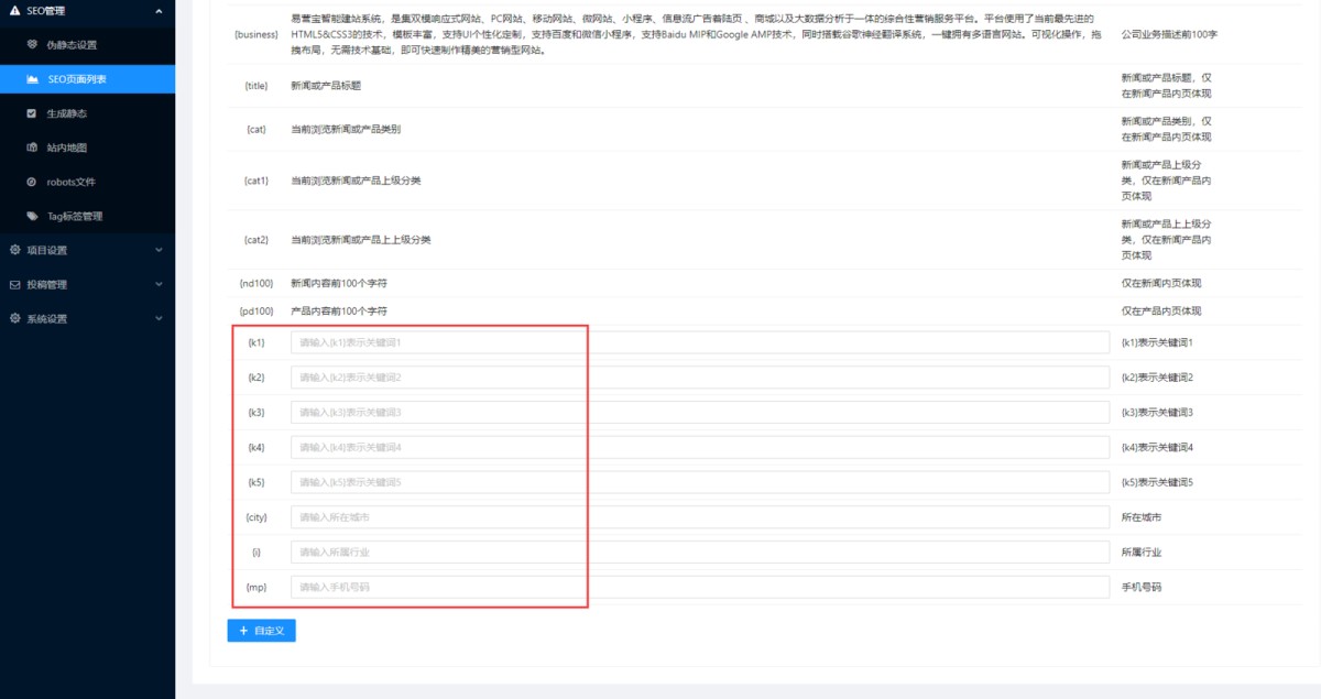 4,以下框红的部分,是可以自定义值的变量,k1到k5一般用于设置SEO的关键词。