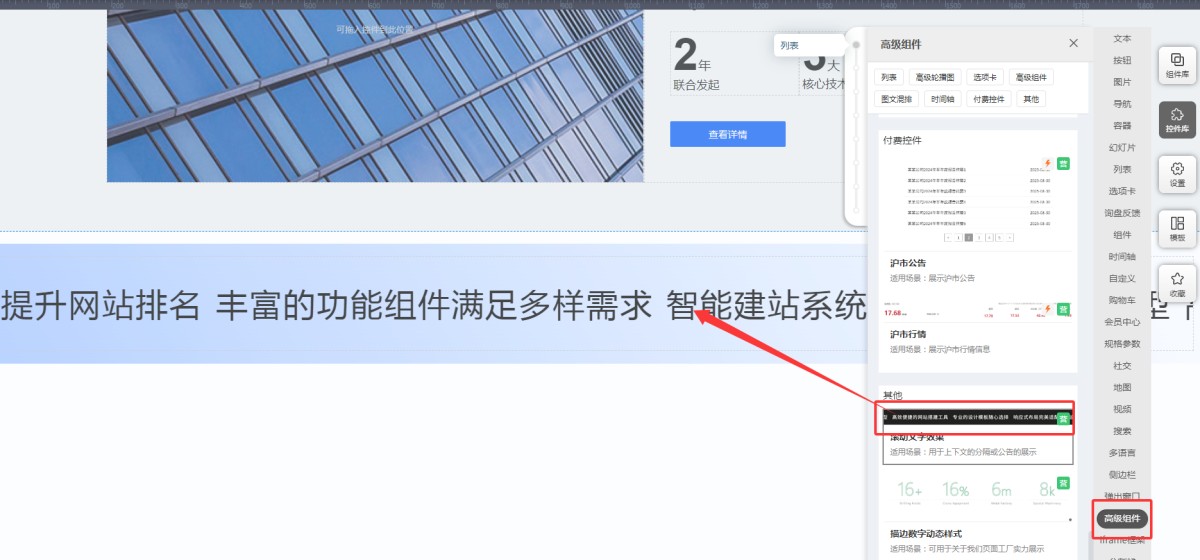 1,在控件库-高级组件里,选择滚动文字效果,拖拽添加到页面或组件里。
