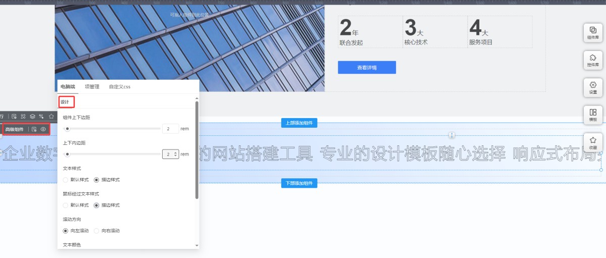 2,在高级组件的属性设计里,可以设置滚动文字的上下间距、文本样式、滚动方向,文本颜色和字号等。