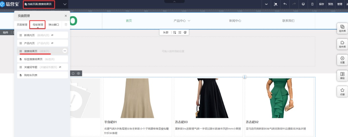 1,在UI编辑页面,页面管理里,点击母版管理-搜索结果页。