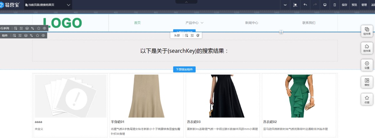 如何需要在搜索结果页展示用户的搜索词,需要在结果页添加一个搜索词的变量,搜索词变量是searchKey,使用时需要添加大括号{ }。操作如下: