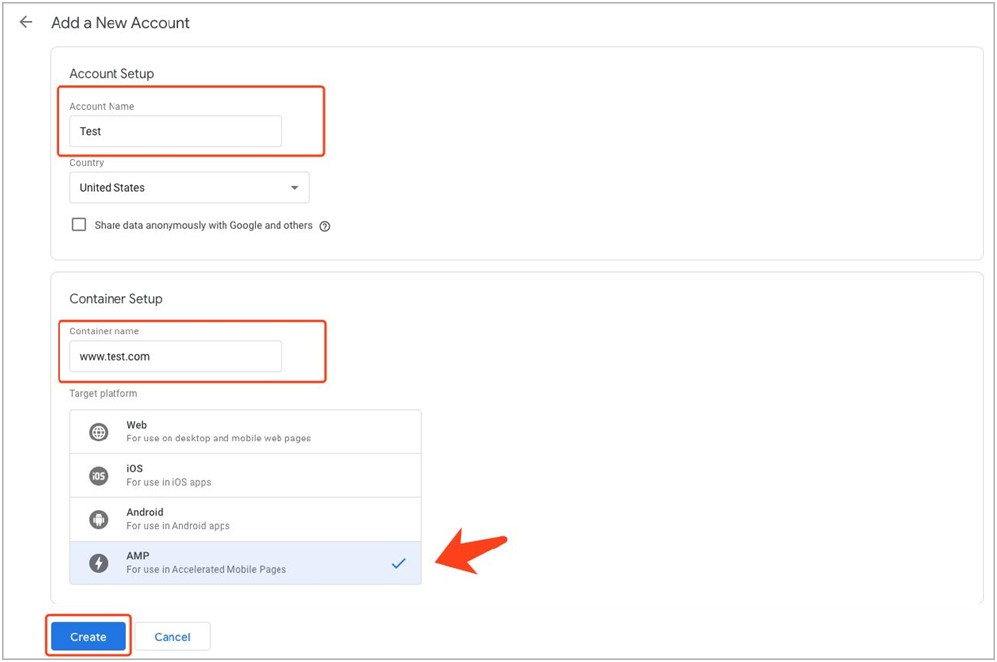 创建一个新的账户(Account)并且配置容器(Container),同时选择目标广告平台(Target Platform)为AMP。