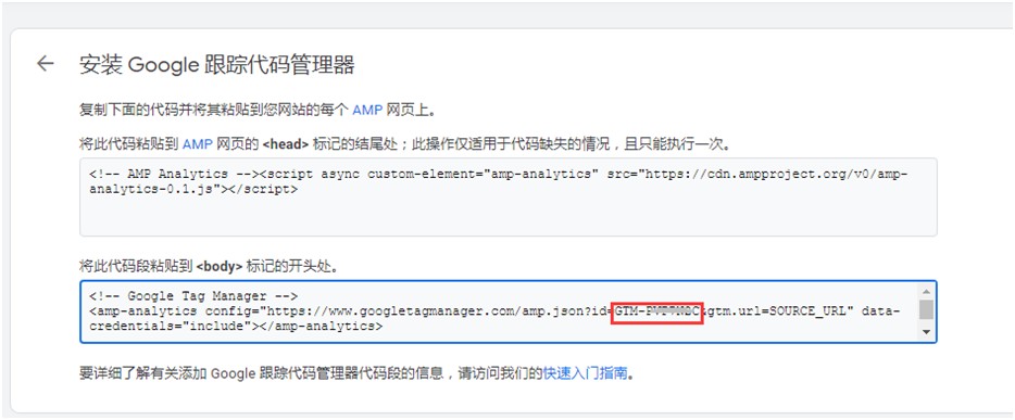 容器(Container)完成初始化后需要安装Google跟踪代码管理器,找到代码里的GTM的ID,如下图