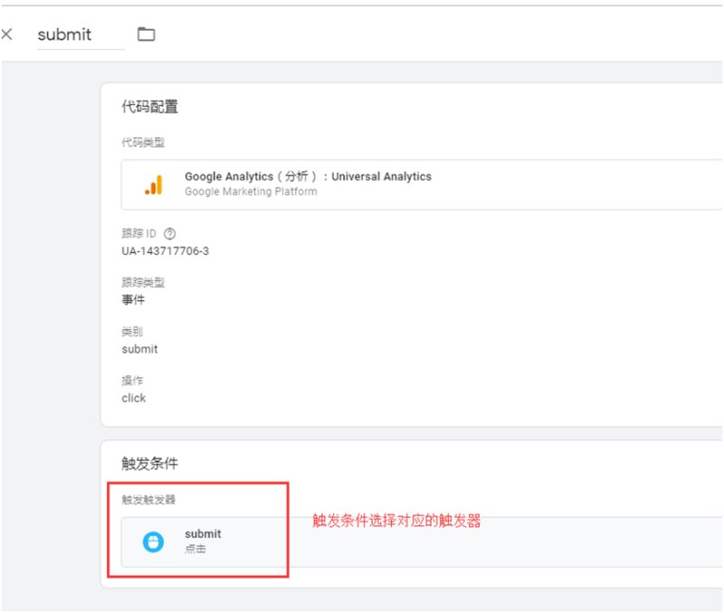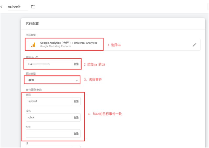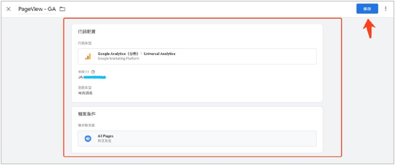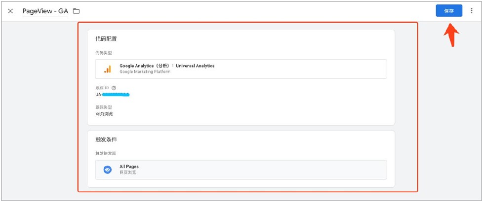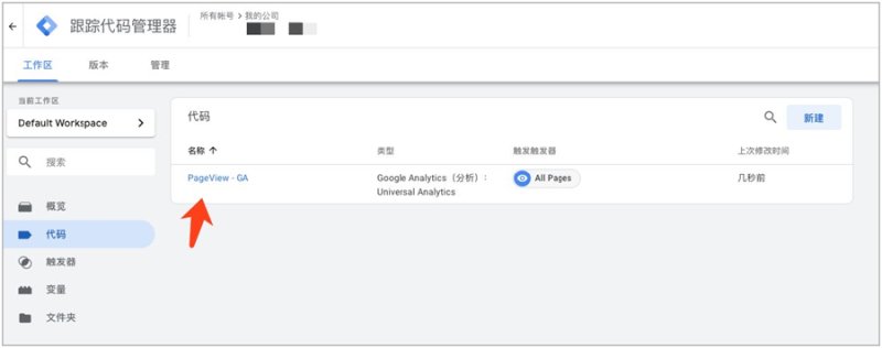 新建代码(Tags),选择Google Analytics(分析): Universal Analytics,输入跟踪ID,创建成功后可在代码(Tags)中看见新建的代码。