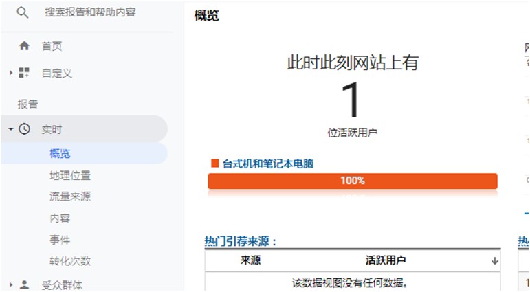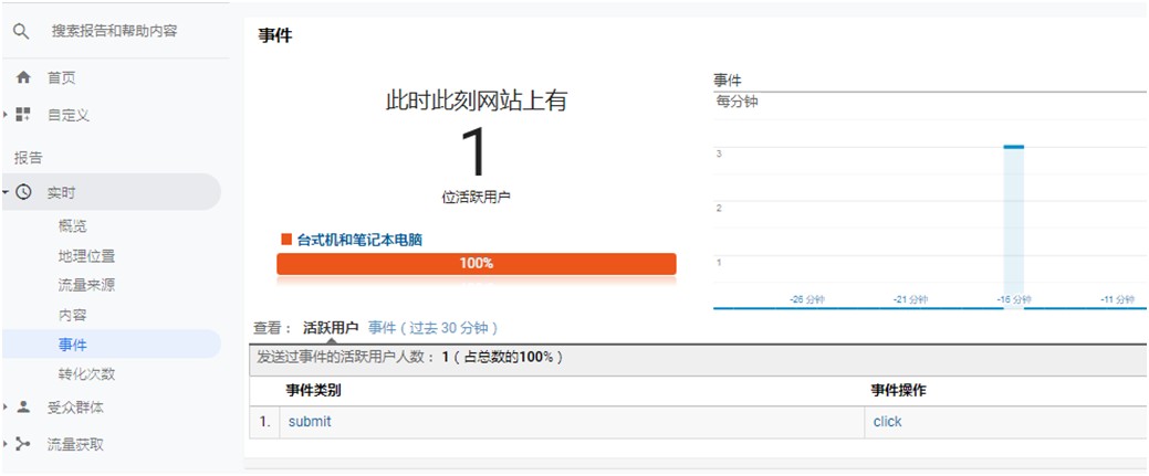 第四步:点击测试,GA实时报告中查看是否生效。