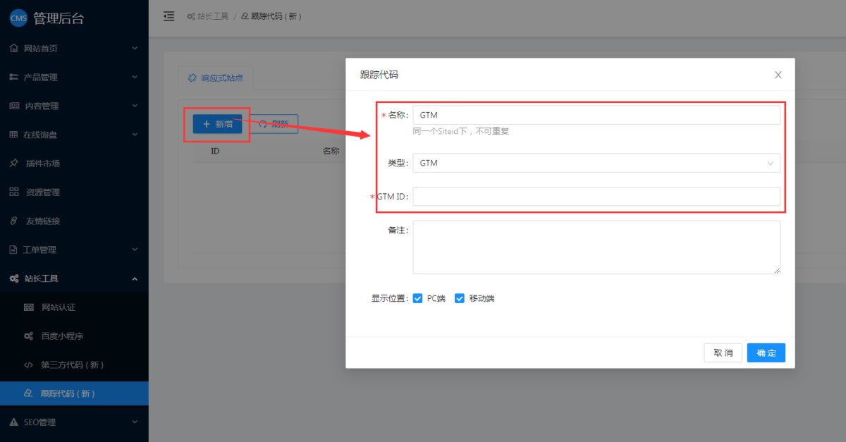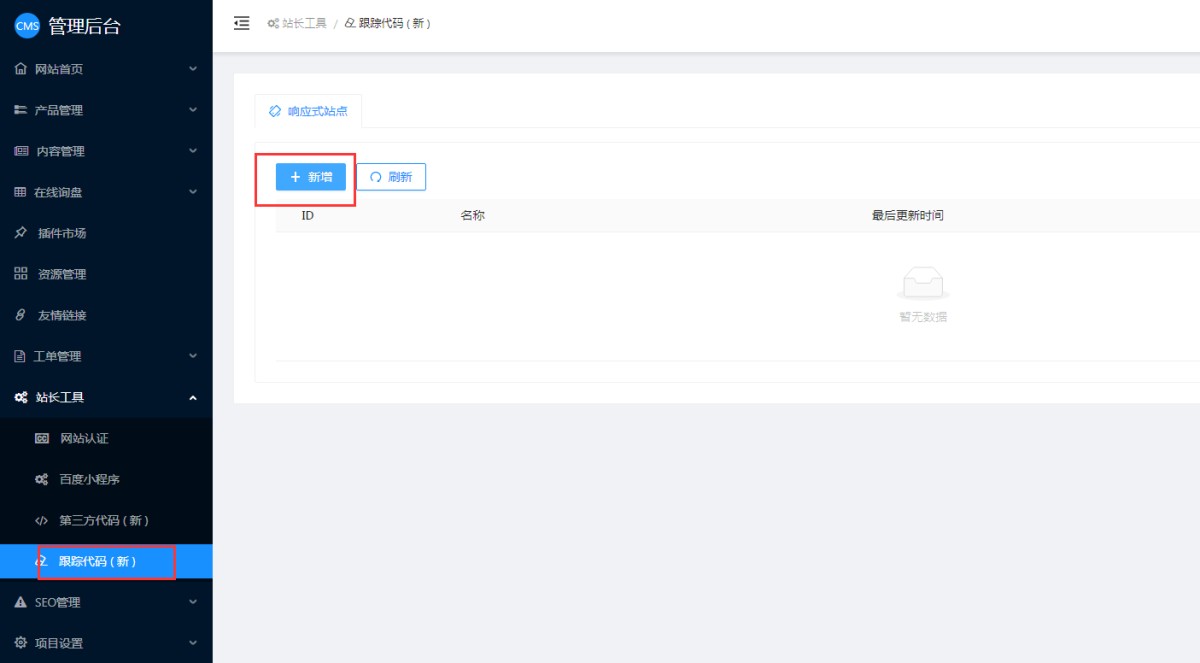 在易营宝后台,站长工具-跟踪代码里点击新增。