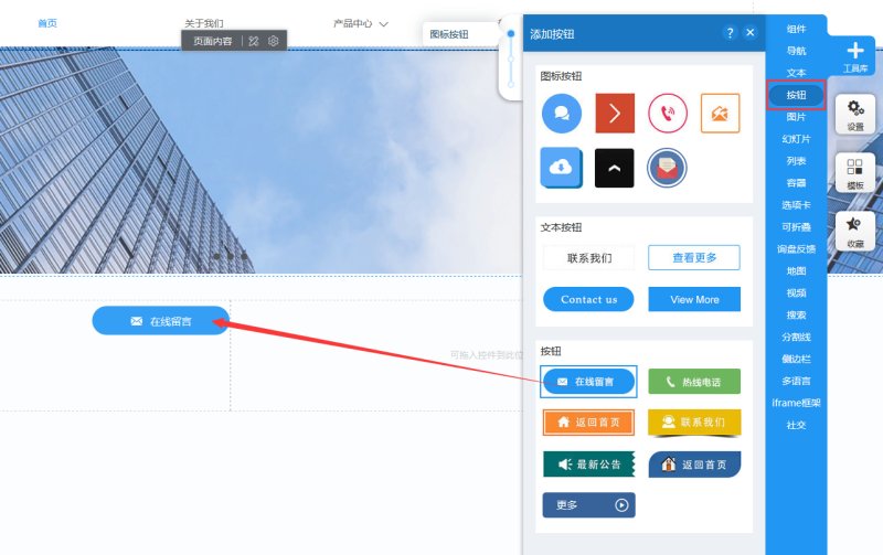 按钮控件在网站中起着跳转链接的作用,链接类型包含:跳转站内页面和锚点、跳转外链、一键邮件、一键电话、返回顶部/底部/上一页、在线咨询(QQ /Skype/Whatsapp)、绑定测导航。