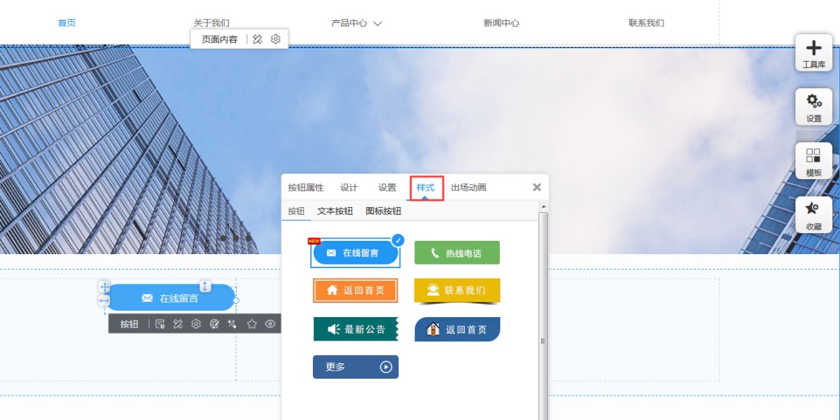 1,在工具库里点击按钮控件,选择合适的样式添加到页面上。按钮控件按照样式分为图标按钮,文本按钮和常规按钮三类。图标按钮是由ICON和背景色组成的,可以实现鼠标经过时ICON变换颜色和大小;文本按钮是不带ICON的样式;常规按钮是ICON和文本左右显示的样式。