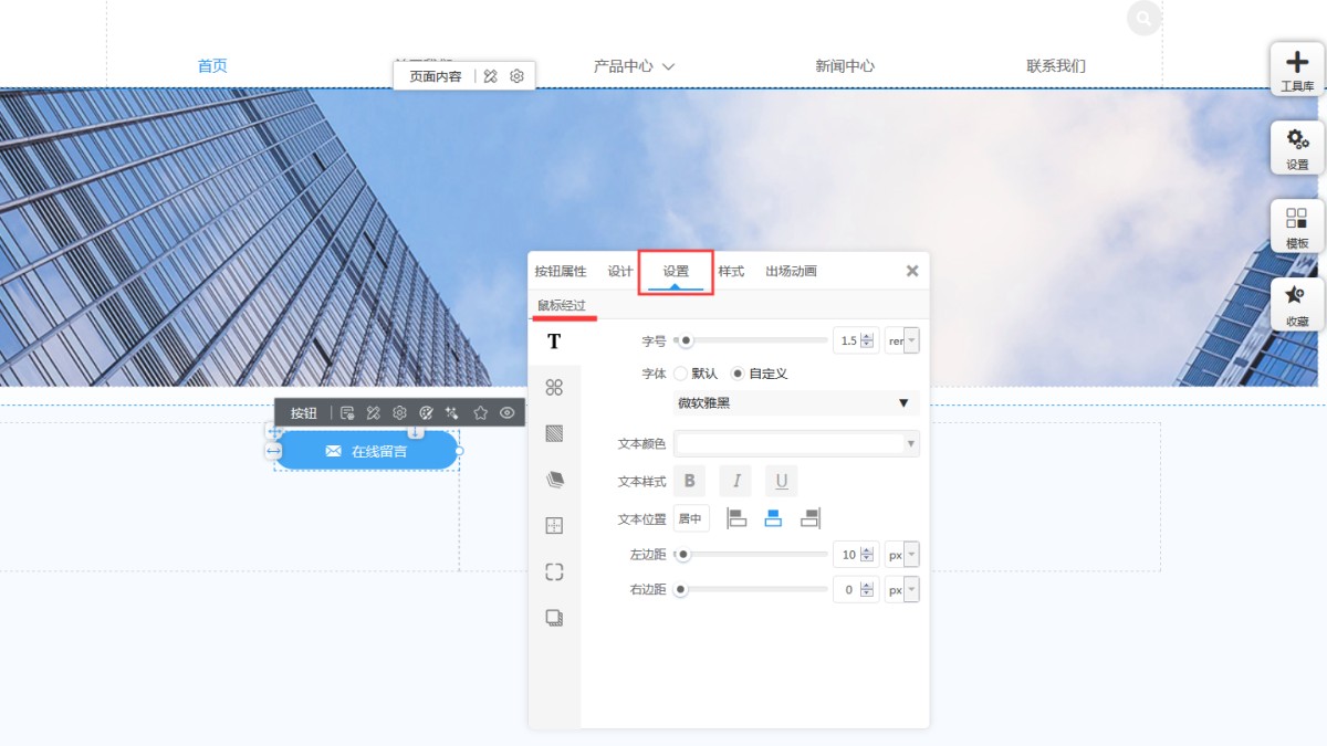 7,在设置里,可以设置鼠标经过按钮时,按钮文本的字号颜色等属性;修改icon的背景色和大小;设置鼠标经过按钮时的动画效果;设置按钮的边框、圆角、阴影。