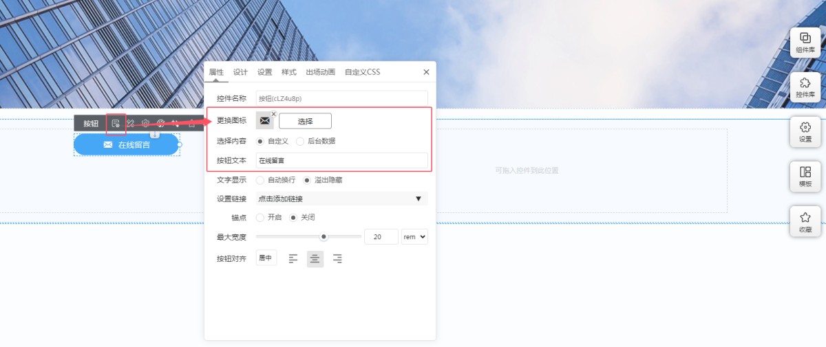 4,点击属性里的设置链接,可以为按钮添加链接,链接类型包含:跳转站内页面和锚点、跳转外链、一键邮件、一键电话、返回顶部/底部/上一页、在线咨询(QQ /Skype/Whatsapp)、绑定测导航。根据需求设置即可。
