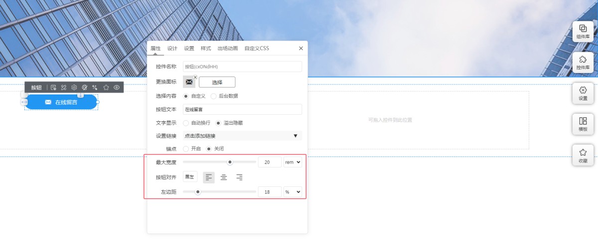 5,在属性里可以设置按钮的最大宽度、对齐方式和边距。最大宽度是指当页面在更大的屏幕上展示时,按钮宽度的最大值。按钮设置居左或居右时,可以分别设置左边距或者右边距。