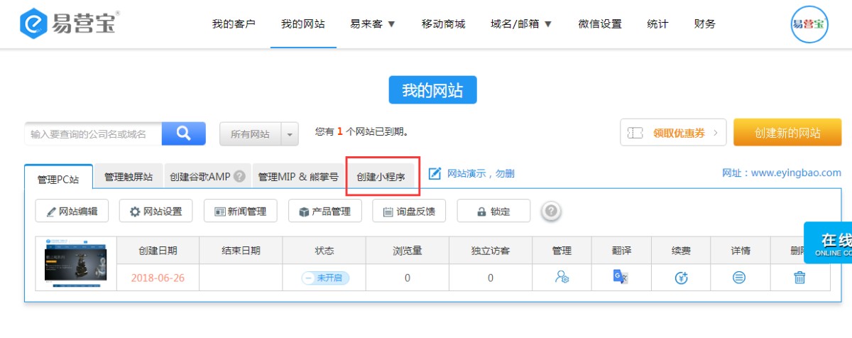 8,使用谷歌浏览器登录易营宝后台www.eyingbao.com,点击创建小程序