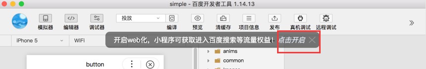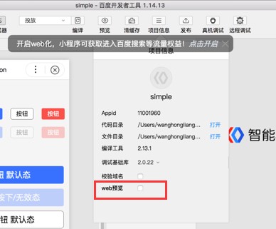 22,进入百度开发者工具后,界面上会提示“开启WEB化”,点击开启