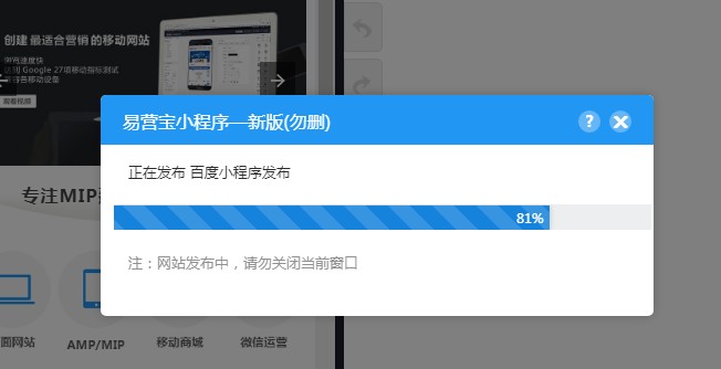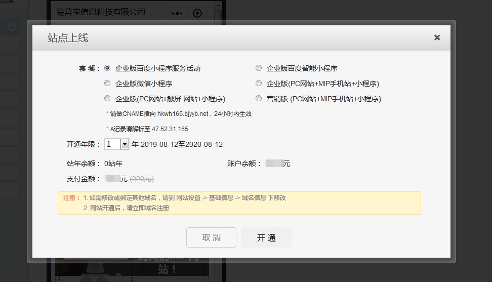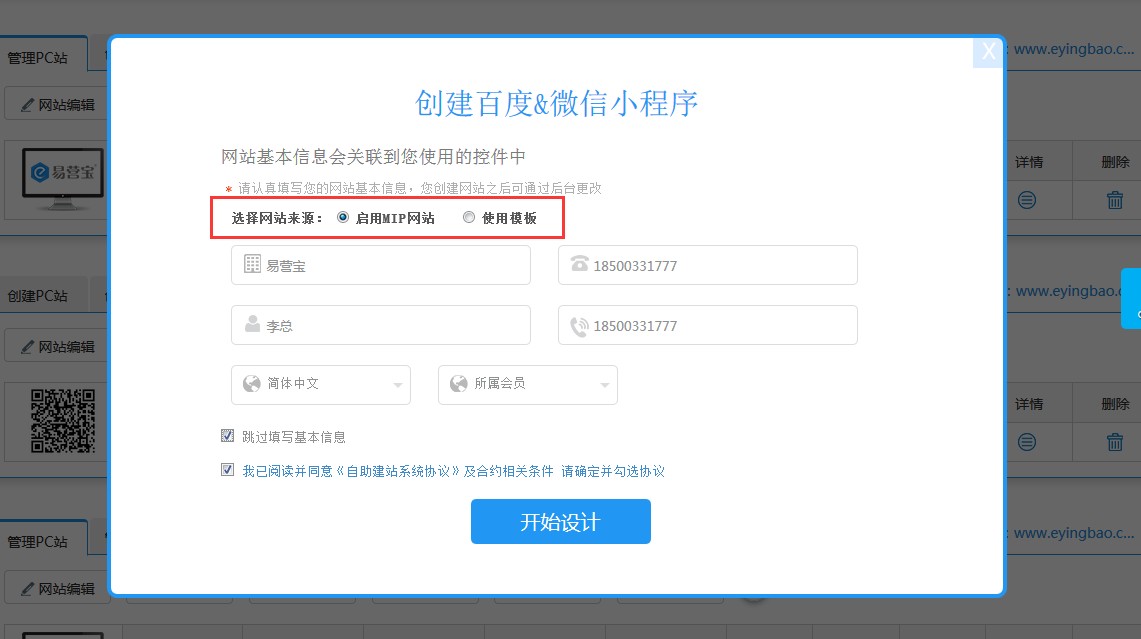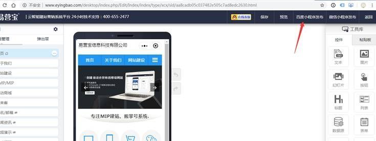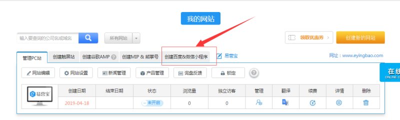 1,登录易营宝平台,如果是新客户,就点击右侧的“创建新的网站”,在弹出窗里选小程序;如果是已在易营宝平台做了PC或移动站了,可以在网站项目下,选择“创建百度&微信小程序”。