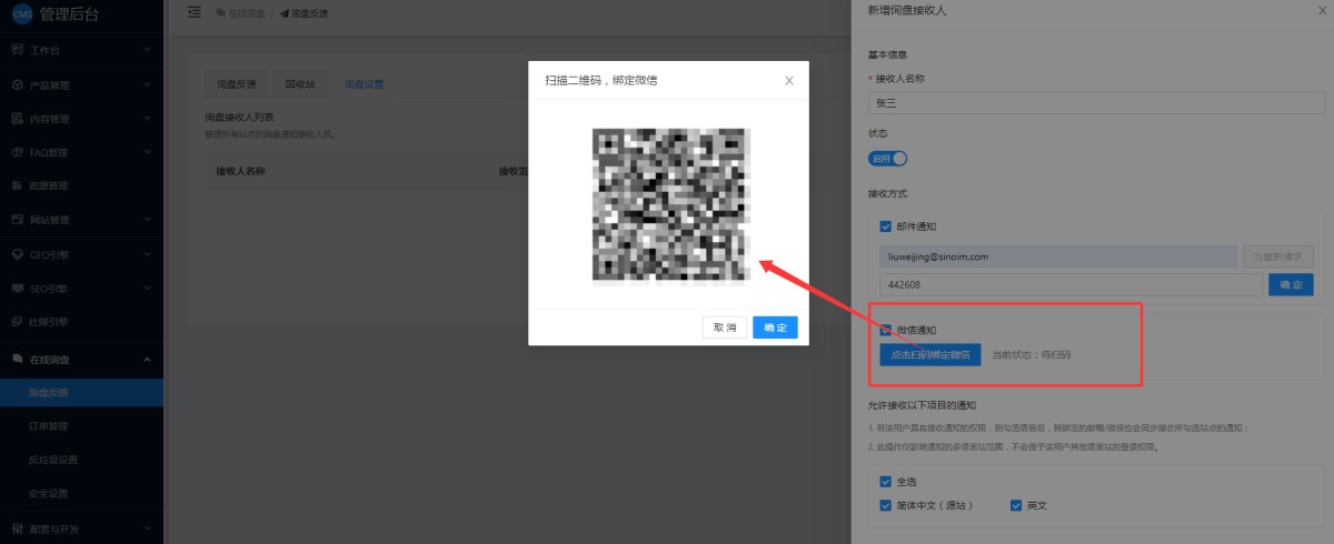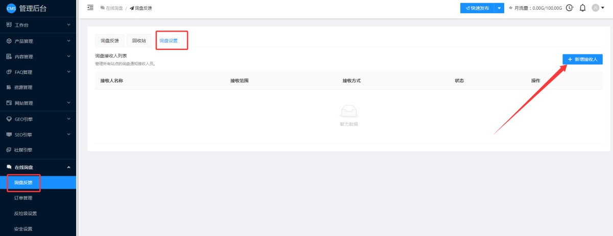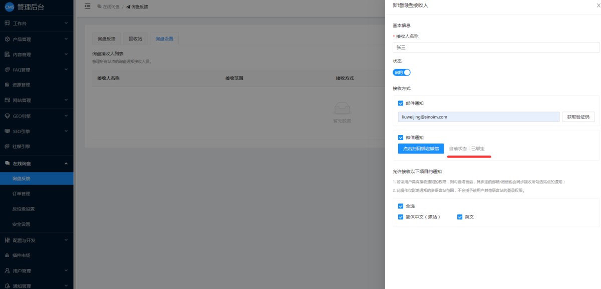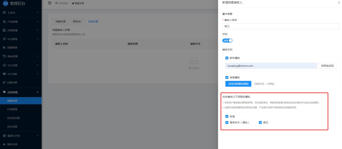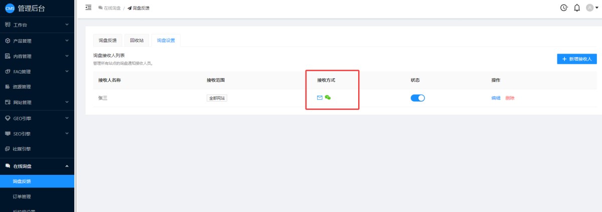 1,在CMS管理后台表单反馈-询盘设置里,点击新增接收人