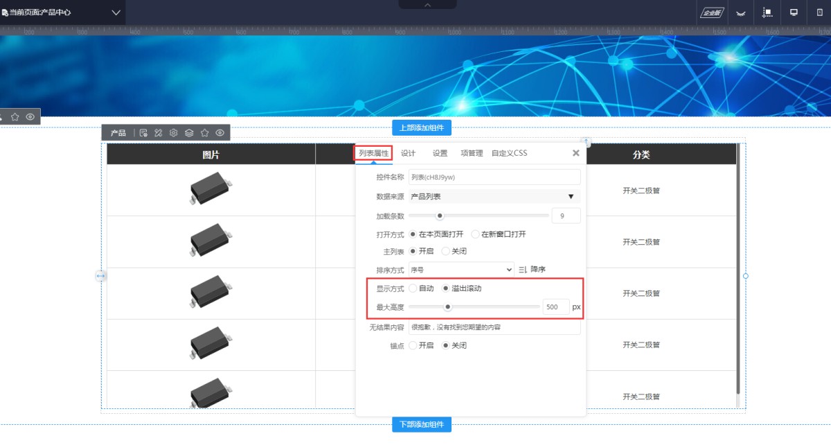 其中显示方式包含自动和溢出滚动两种。自动是指列表无固定高度,而是根据列表内容自动匹配;溢出滚动是指设置一个最大高度值,列表内容高度高于这个值时,进行滚动展示。