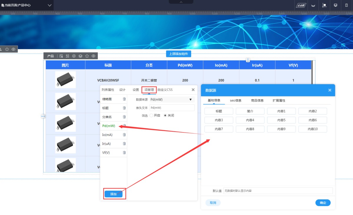 5,在列表属性-项管理里,可以对表格列表的项进行管理,包含添加、修改、删除。添加时可以选择调用后台的产品数据源,包含基本信息、SEO信息、商品信息和扩展字段。