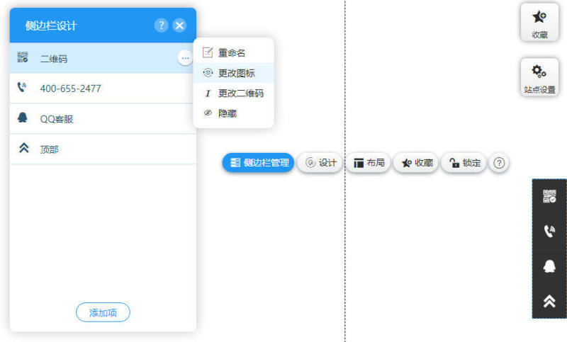 3,点击 侧边栏管理,该属性中,可以对侧边栏导航项进行重命名,更改图标,更改二维码,更改链接,隐藏或删除 等操作。