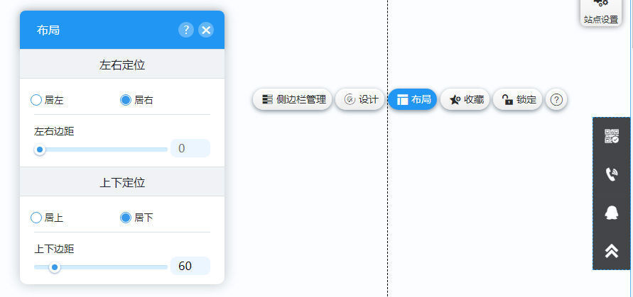 5,点击 布局 按钮弹出布局属性面板,在这里你可以设置侧边栏左右定位位置和上下定位位置。