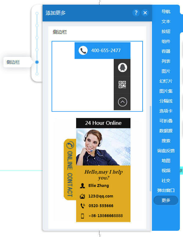 1,在工具库里点击更多找到侧边栏控件,选择侧边栏的样式,我们目前提供2种样式的侧边栏。