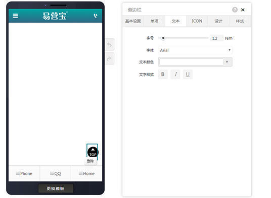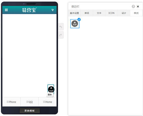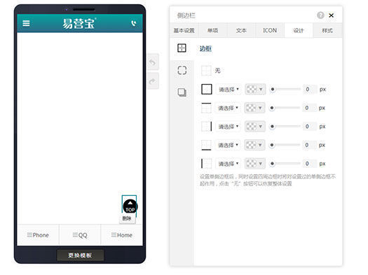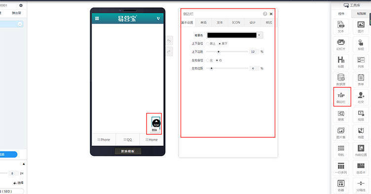 在页面编辑里拖入侧边栏,显示侧边栏的基本设置,在基本设置里可以设置背景色,上下定位(可以选择居上或居下),上下边距,左右定位(可以选择居左或居右),左右边距,在页面里可以删除侧边栏。