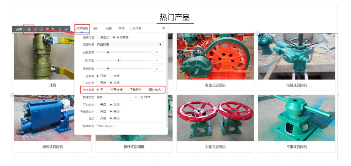 1,在列表属性里,有个点击效果的设置,系统默认是“打开详情”,如果想要实现点击产品列表时不进详情页,可以把点击效果设置成“无”或者“图片放大”。