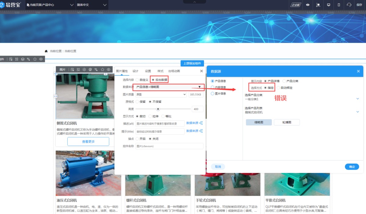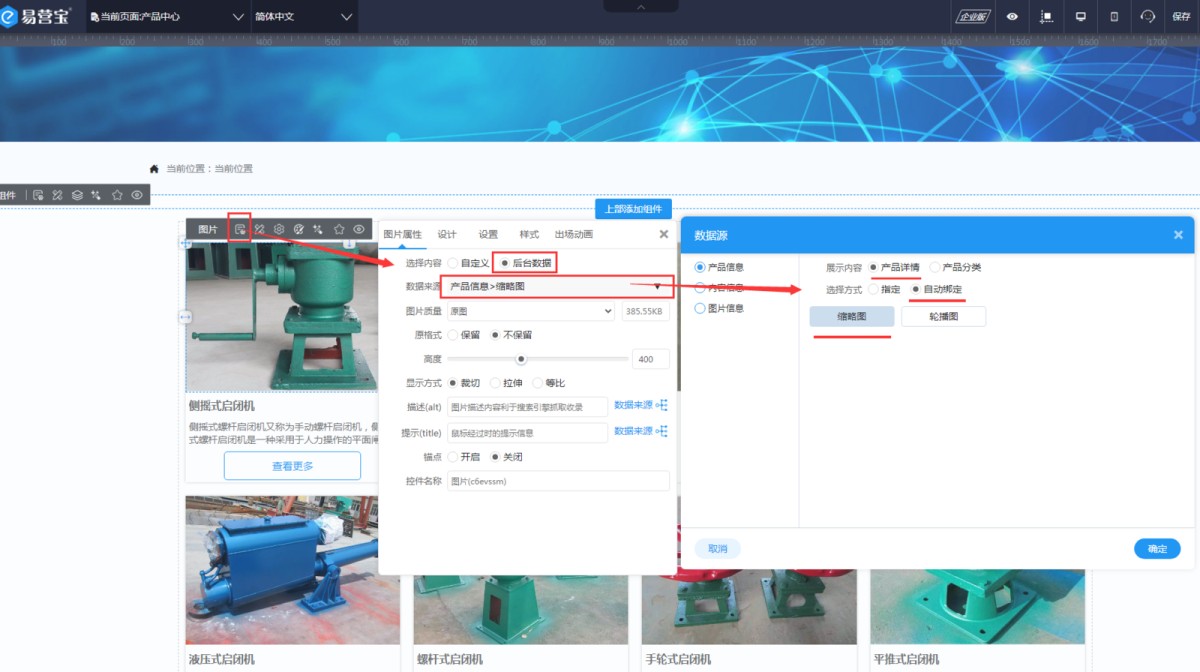 3,正确的设置方式:点击列表上的图片,在图片属性里,选择后台数据源,展示内容选产品详情,选择自动绑定-缩略图。这样列表就会对应产品显示缩略图了。