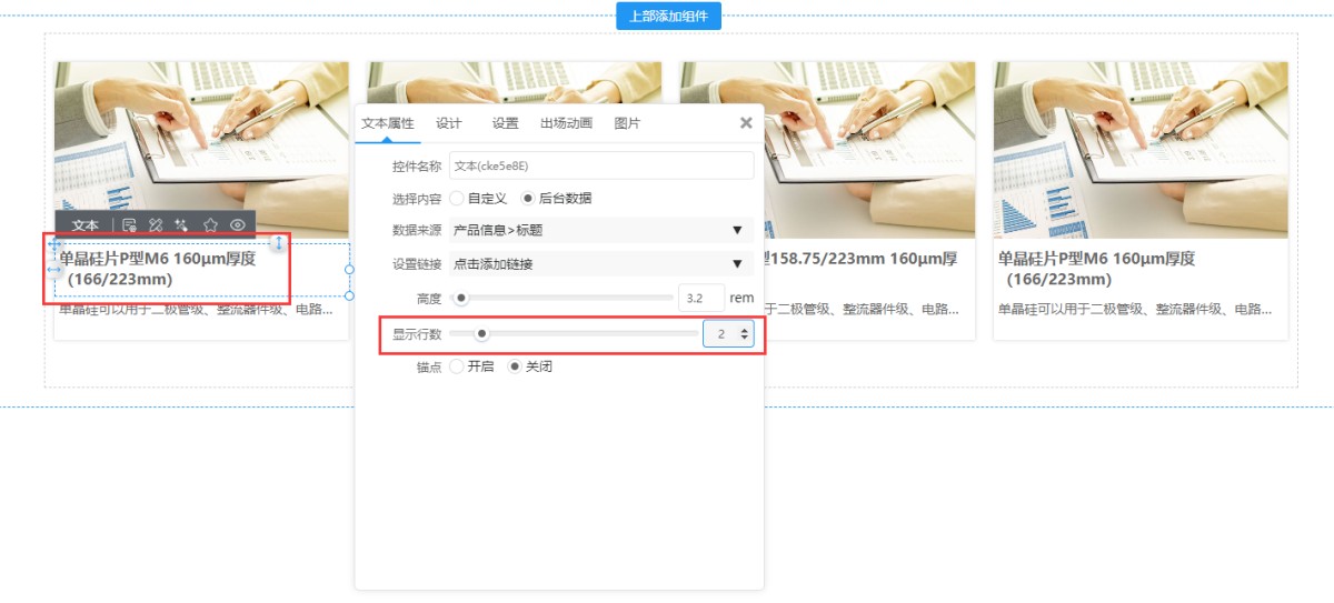 2,在产品列表上点击第一个产品的标题或简介控件,在控件属性里,有个显示行数的设置,根据需求设置行数即可,设置完保存刷新,其他产品会同步生效。