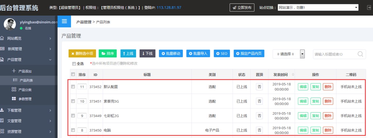 1, 将产品A电脑和3个显卡都添加到后台产品里,为方便区分,可将A电脑和和显卡设置不同的分类。