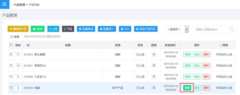 2,点击“编辑”,进入产品A电脑的编辑页面。