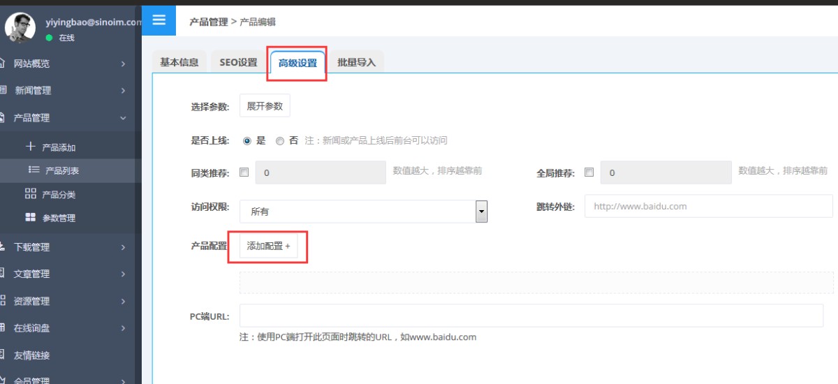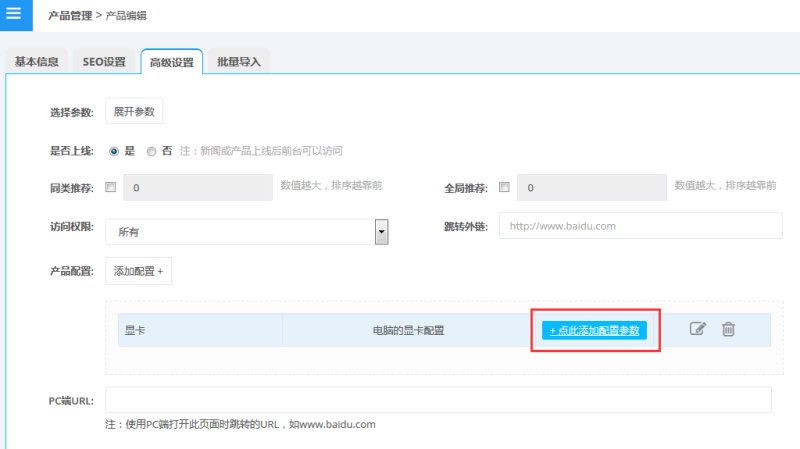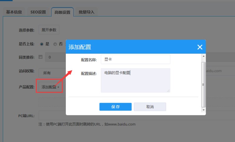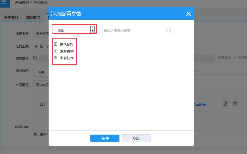 产品选配主要用于产品带配件的情况下,访客可以针对产品和配件一起提交询盘。例如:企业展示的产品是A电脑,同时提供3种显卡供客户选择。 3种显卡分别是:索泰克5G、七彩虹2G和默认显卡。在A电脑的产品详情页提供选择显卡的功能。我们按照这个案例来设置选配。